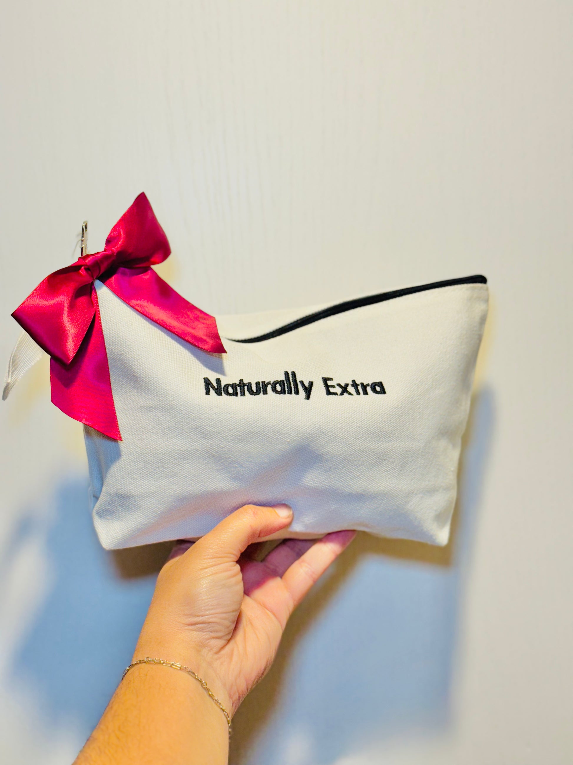 • Canvas zipper pouch — reusable, washable, and gift-ready with a satin bow